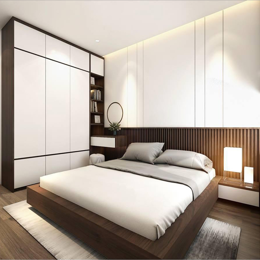 Sử dụng nội thất đồ gỗ luôn khiến bất kỳ ai phải mê mẩn bởi đường nét sang trọng, tinh tế từ vân gỗ, màu sắc. Lựa chọn tone màu trắng làm chủ đạo cho toàn bộ căn nhà, tủ gỗ, giường gỗ, sàn gỗ và bàn ghế là điểm nhấn ấn tượng khiến người xem phải cuốn hút hay từ ánh mắt đầu tiên. Thiết kế nội thất chung cư với những hình khối vuông vức khiến cho không gian thêm khỏe khoắn, gọn gàng.